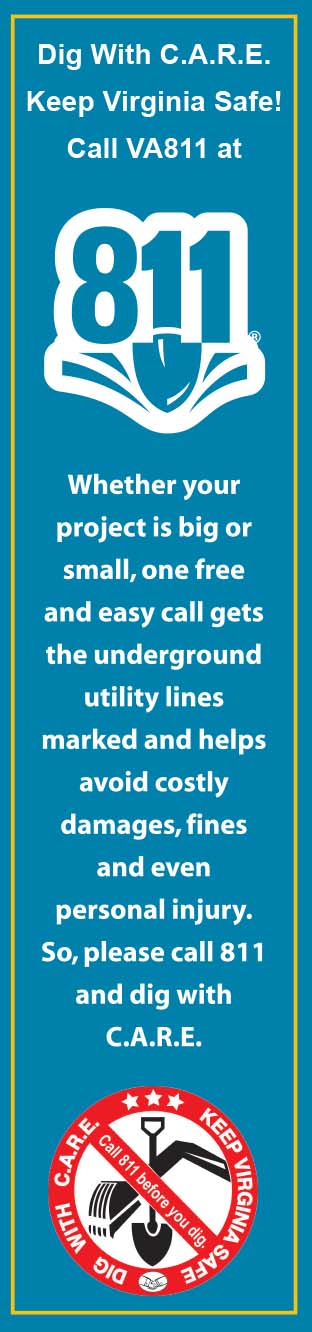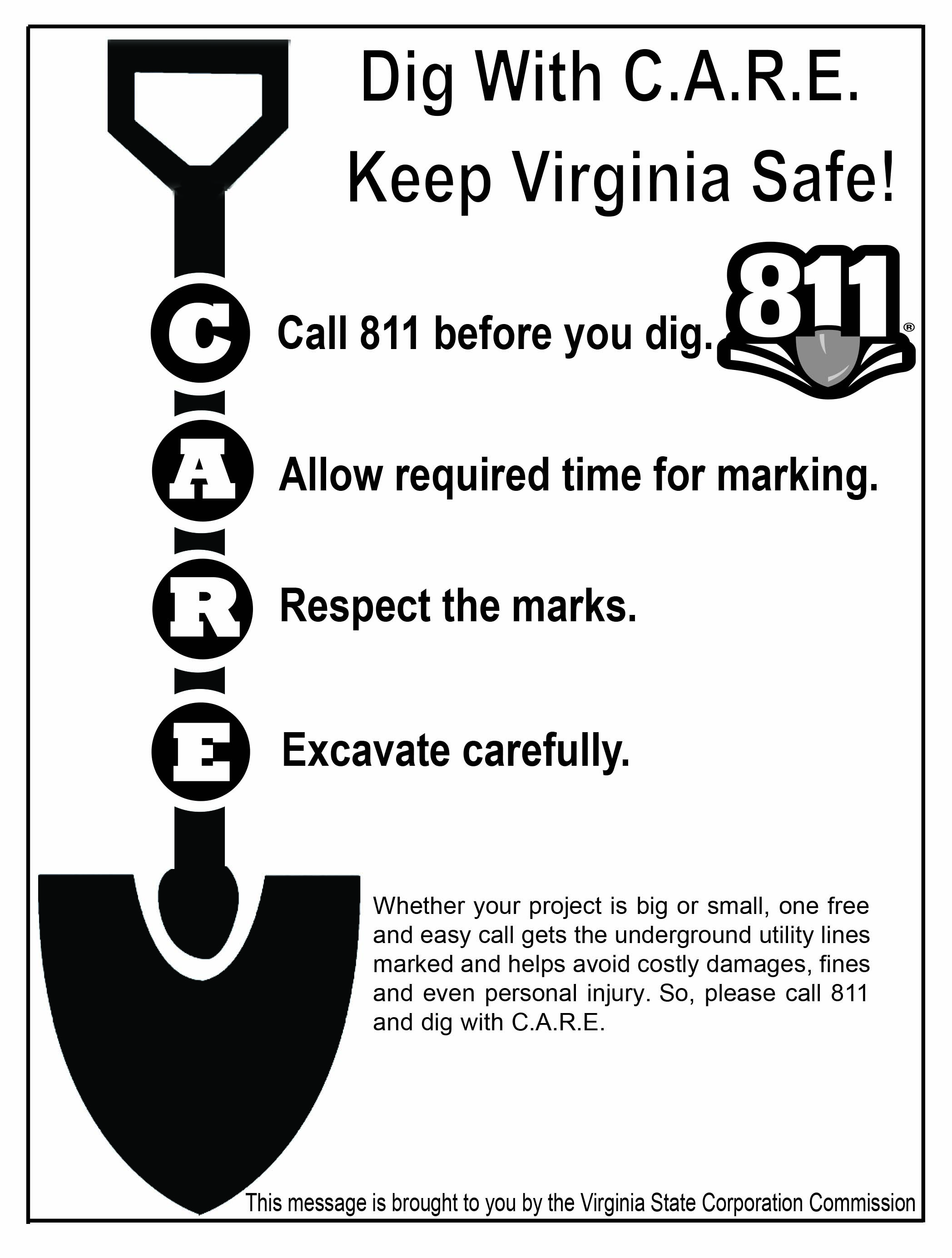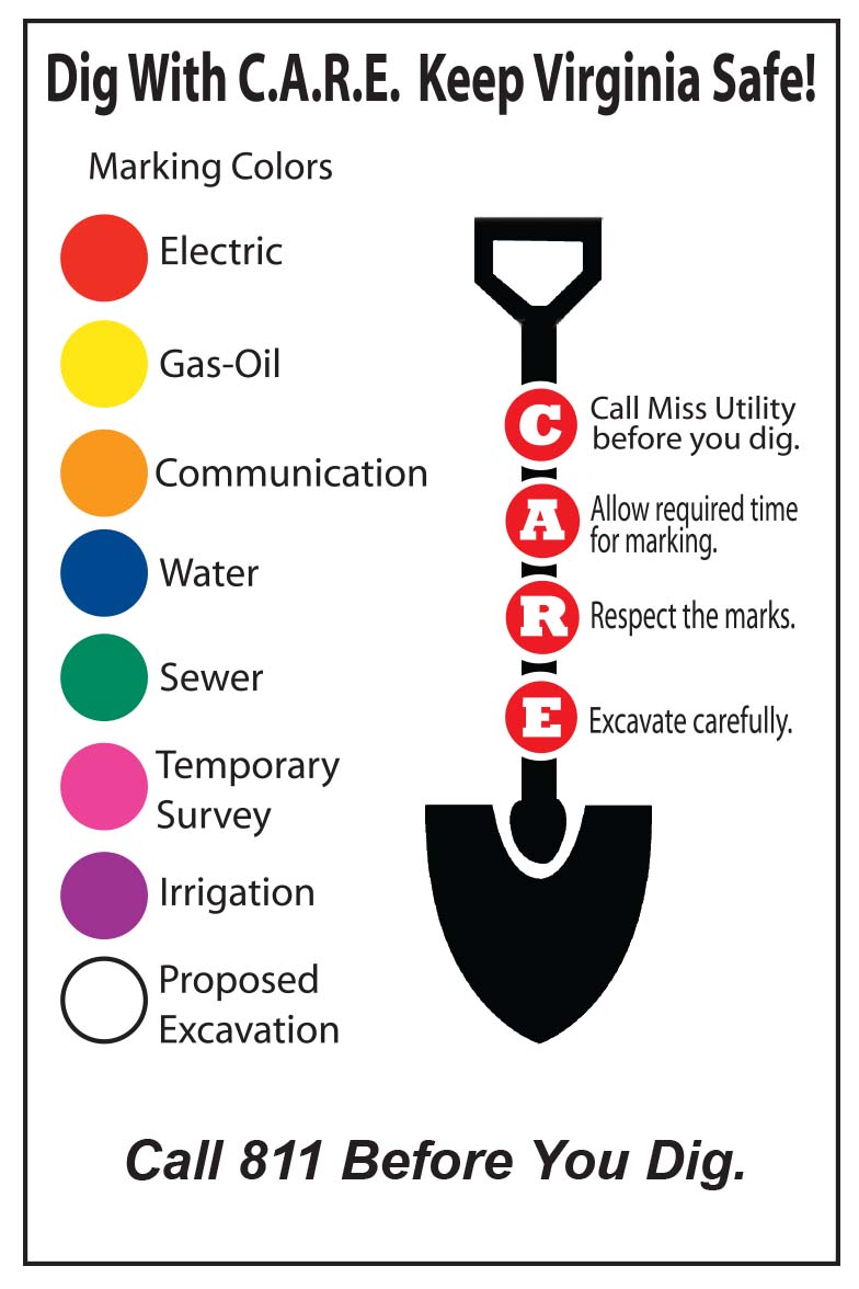 - Radio, television, newspaper, trade magazine, high school athletic sporting event, homeowner association, and billboard advertisements to encourage excavators to "Dig with C.A.R.E." in Virginia;